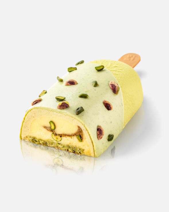 Biscuit pistache, glace pistache grillée de Sicile, sorbet mandarine de Sicile, praliné pistache et fleur de sel, glaçage chocolat pistache