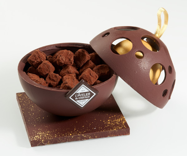 Avant de fondre pour la Boule Bonbonnière de chocolat noir emplie de Truffes fondantes et moelleuses, nul doute que vous serez surpris par la Bûche de Noël revisitée par l’Atelier du Chocolat : un voyage gustatif et pétillant dans le monde du Chocolat qui ravit les yeux par son originalité et ses éclats de couleurs.