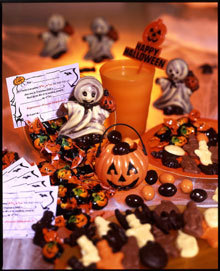 À dévorer séance tenante : gentils fantômes blancs (chocolat au lait, recouvert de chocolat blanc ; 13€), masques sorcières et citrouilles (6,10 €), citrouilles garnies de friture halloween (coffret citrouille à 11 € - friture chocolat au lait, noir, blanc ; 38€/kg), de chocofeuilletés noirs et oranges (30 €/kg) ou de calissons à l'orange (43, 34 €/ kg) et bonbons fourrés aux fruits (21,35 €/kg)…