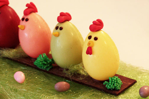 Bec en cul de poule et crête coquette, les 4 starlettes font le pied… de poule sur leur plaquette cacao dans la vitrine du célèbre chocolatier montmartrois. Craquantes et colorées, elles s’acoquinent de quelques surprises… A chaque cocotte son costume et son cœur croquant : un petit œuf gourmand !