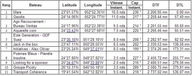L’équipage de Transport Cohérence (Parnaudeau/Jouandet), qui ne peut plus compter sur son pilote automatique, lutte contre la fatigue. Les deux Benoit doivent barrer en permanence et n’atteindront Saint-Barth qu’en fin de semaine. Ils prévoient un arrêt express pour récupérer un pilote avant de poursuivre jusqu’à Progreso.
