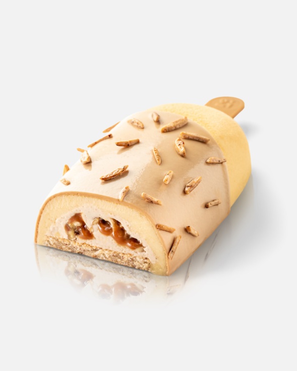 Biscuit moelleux noix et amande, sorbet poire des Alpes, glace noix du Dauphiné, caramel coulant, éclats de noix, glaçage chocolat Dulcey