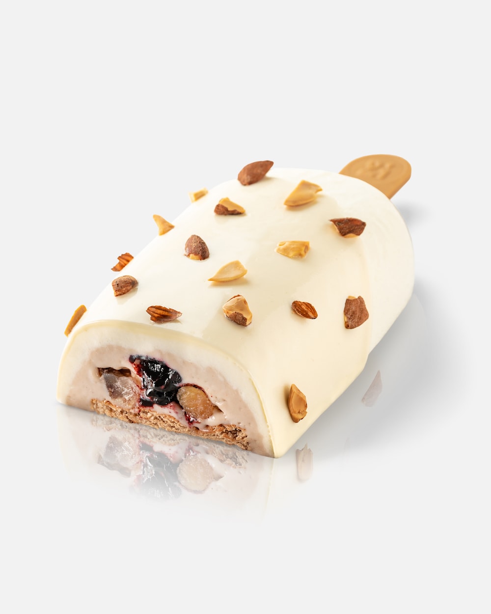 Biscuit moelleux châtaigne, glace yaourt des monts d’Ardèche, glace marron, éclats de marrons glacés, confiture de myrtille, glaçage chocolat Ivoire