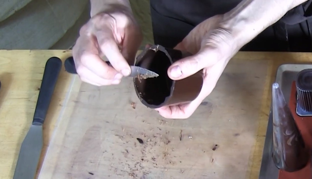 On va voir la partie raclage. Les moules sont bientôt prêts. On va enlever le surplus. En général, il vaut mieux le faire un petit peu plus en amont pour éviter de casser le moule. On gratte pour avoir vraiment le moule en question. Vous entendez craqueler. On peut le remettre tout doucement, délicatement. Vous prenez un par un. Vous enlevez en fait le surplus. Vous y allez tout doucement, toujours avec le dos du couteau et vous allez récupérer ensuite le chocolat. S’il y a des très grands morceaux, vous pouvez utiliser la partie coupante, très délicatement, pour que le gros morceau ne sa casse pas et casse un morceau de chocolat. Dans ce cas-là, tout votre chocolat serait cassé. N’appuyez pas trop, puisque cela risquerait de casser le moule. Il faut vraiment qu’il soit posé dans votre main. Si vous appuyez trop, le moule risque de se casser. Si vous avez des petits morceaux de plastique qui viennent avec, je vous invite à jeter cette partie-là. Ce n’est plus alimentaire. Vous l’avez vu tourner. Cela veut dire qu’il est bon. Vous voyez, un beau joli cône. On peut les mettre allongé pour éviter qu’ils tombent et qu’ils cassent. Ils ne sont pas encore tous prêts. Là, cela colle encore. On va le laisser refroidir.