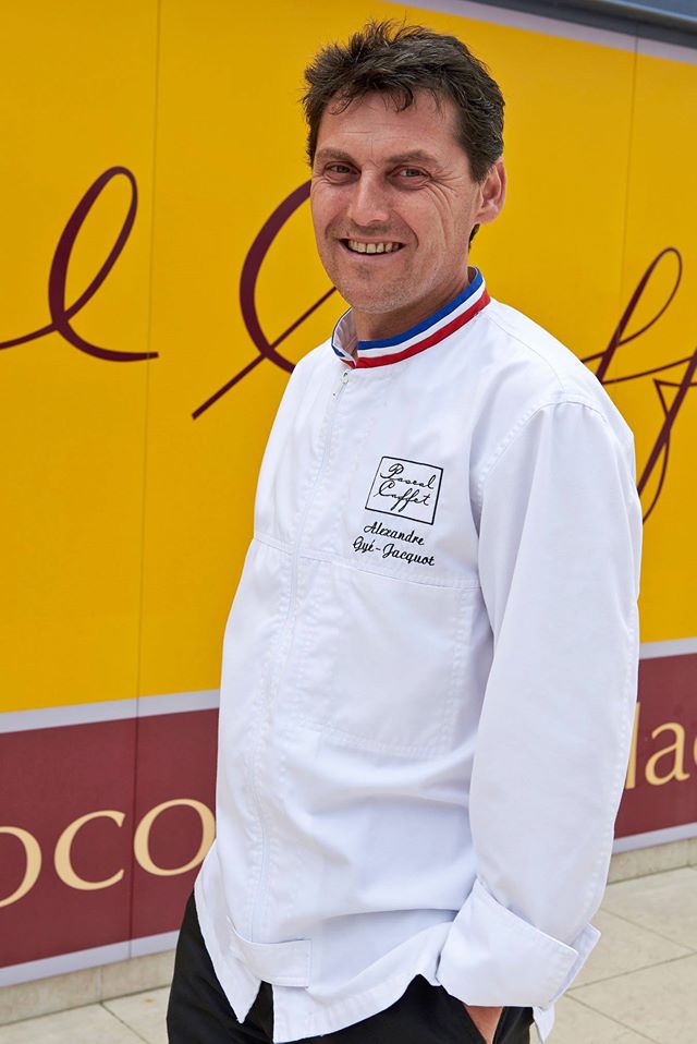 Alexandre Gye-Jacquot entre pour la première fois dans les ateliers de Pascal Caffet à l’âge de 16 ans. Il se particularise très rapidement des autres apprentis grâce à sa rigueur et son dynamisme. Quant à la Maison Caffet, elle lui offre un environnement favorable à l’acquisition des techniques fondamentales de la pâtisserie et aussi à l’épanouissement de son savoir-faire. Poussé par son ambition, Alexandre se présente au concours de Meilleurs Ouvriers de France Chocolatier-Confiseur en 1996. Grâce à une création sur le thème imposé du « souvenir d’enfance », il remporte ce titre prestigieux. Fidèle à la Maison Caffe, il poursuit son parcours aux côtés du chef Pascal Caffet. En parallèle, il confronte son talent à de nouvelles compétitions, et notamment au Championnat du Monde des Métiers du Dessert où il décroche une médaille d’argent en 2002, puis une médaille de bronze en 2004. Grâce à sa capacité de travail ainsi que sa passion pour le métier, Pascal Caffet lui confier le poste de Chef de Production. Au coté de Mathieu Blandin, Alexandre Gye-Jacquot dirige la trentaine d’ouvriers de l’équipe de production de la Maison Caffet et participe à la conception des nouvelles recettes, avec comme domaine de prédilection le praliné.