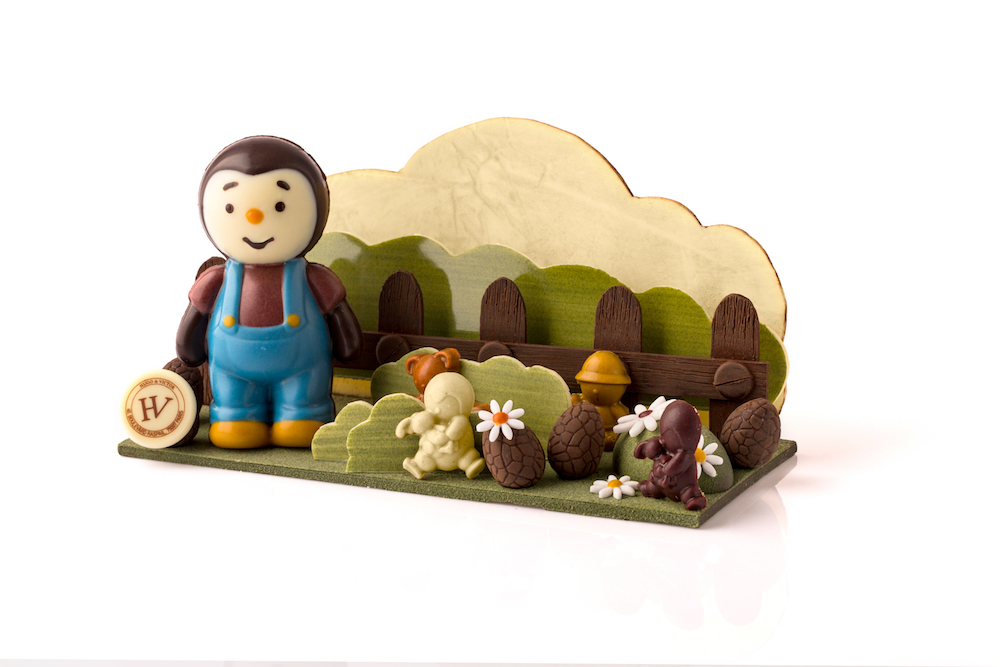 Depuis 2010, Hugo& Victor lance des thèmes variés pour ses créations de pâques : comme les arts, Gavroche, les fables de La Fontaine, la mer, le carnaval des animaux... sans oublier pour autant les pièces classiques et cherche à révolutionner les typiques de pâques tels que les œufs les poules et poissons .Pour cette année Hugues Pouget et Thierry Courtin proposent aux enfants de retrouver en chocolat, Tchoupi et sa bonne humeur dans les boutiques Hugo & Victor. Hugues Pouget a veillé particulièrement à ce que les produits soient colorés aux poudres naturelles de fruits, de légumes et d’épices pour la santé de tous, spécialement celle des enfants. Un démarche qui sera étendu à toute la gamme chocolatière et pâtissière pour supprimer de façon définitive, tout colorant et additifs de son laboratoire.