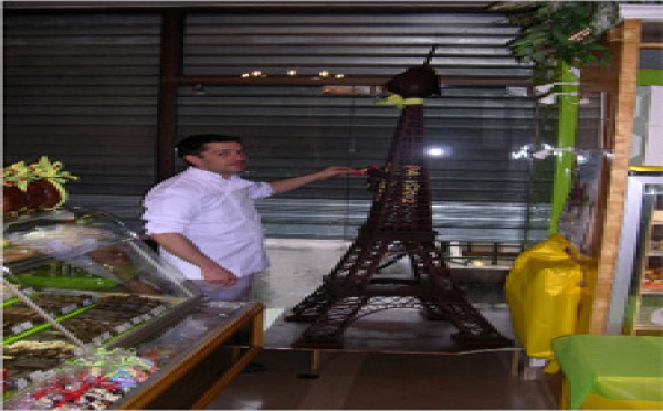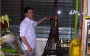 Le 15 mai prochain, notre dame de fer soufflera pas moins de 120 bougies. La belle Tour Eiffel a du coffre ! Le chocolatier Laurent Demoncy de la pâtisserie de l'Eglise lui rend un hommage chocolaté, à l'occasion de la candidature française au JO pour 2012. Une grandeur à la hauteur de la grande dame, pas moins de deux mètres...