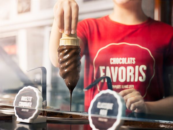 Plus d’une douzaine de comptoirs dispersés à travers toute la province du Québec, et 37 ans d’engouement indéfectible sans cesse grandissant, le pouvoir de la sauce chocolat façon Chocolats Favoris n’est plus à prouver. Depuis 1979, cette glacerie-chocolaterie artisanale a créé une petite révolution dans l’univers des choco-addicts en réinventant la fondue cacaotée, soit en l’apprêtant comme enrobage intégral de ses crèmes glacées, ou en la préparant en conserve, prête-à-déguster. Il vous suffit, à vos heures choisies, de tremper la boîte dans de l’eau chaude pendant 20 minutes, puis de l’ouvrir et de la déguster à même le contenant.