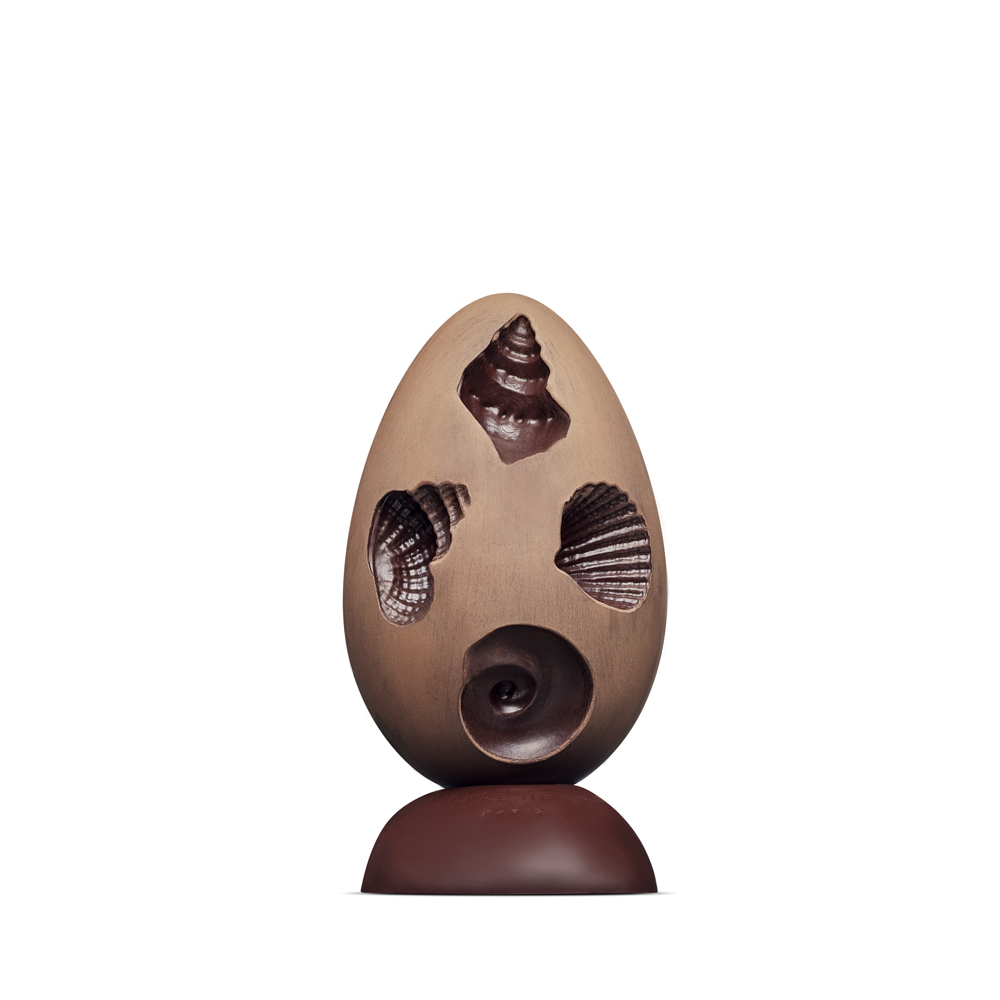 Deux années, ce sont le temps nécessaire pour reproduire en chocolat l’ouvrage inventé par Thomas Boog. Sculpté par des coquillages et des coraux, la face de l’œuf est composée de deux chocolats mettant en valeur visage déstructuré, à la manière des œuvres d’Arcimboldo. Cet œuf nommé « prestige », est en édition limitée en chocolat au lait et face chocolat blond, chocolat blond et face chocolat au lait, en chocolat noir Pure Origine Belize et face chocolat au lait. Cette collection se complète par des moulages de nautiles. Ce fameux coquillage en forme de spirale est présenté telles des œuvres d’art sur son socle. Une autre sculpture, l’œuf Poséidon présente pour sa part un œuf orné d’empreintes de coquillages.