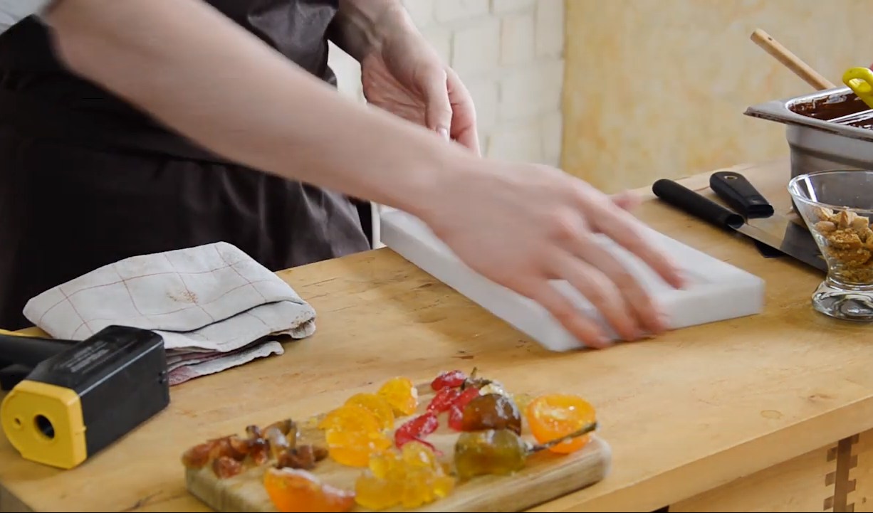 Nous allons préparer, cette fois, sur cette tablette de chocolat, une tablette de chocolat aux fruits confits et de l’autre côté une tablette aux biscuits.