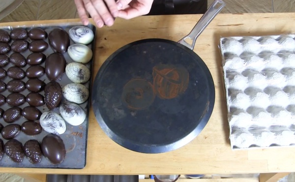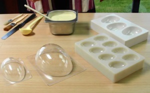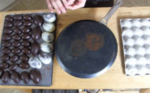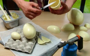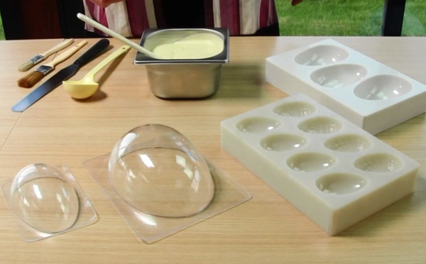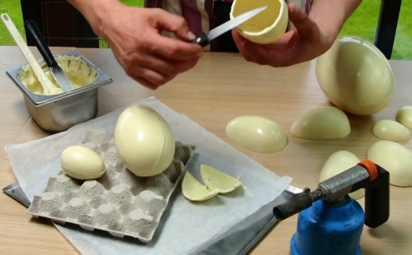 Apprenez la réalisation des yeux en chocolat Bonjour, ici Sébastien, je suis avec Christophe. Donc aujourd'hui on va vous présenter la base pour faire ou réaliser un chien en chocolat blanc. La base sera avec de différentes coquilles d'œufs. Donc là vous voyez autour de vous le chocolat blanc et les différents moules à utiliser...