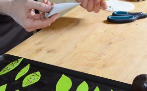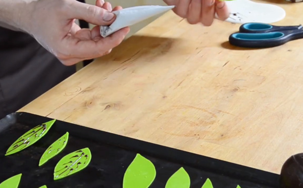 Apprenez cette technique de feuilles mortes avec rainures Donc voilà, mes feuilles, que je vais décorer avec le cornet. Je vais tout simplement dessiner les traits et les rayures de la feuille. Par exemple, ici, je vais tout simplement dessiner des petites rainures. On peut faire un cornet très fin. Je vais d'ailleurs faire un...