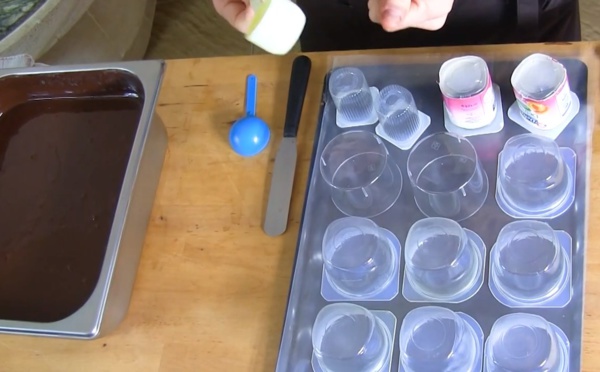 Découvrez la méthode Baby : technique du verre en chocolat noir Je vais commencer à garnir d'une première couche et une deuxième couche pour qu'on puisse avoir des desserts au chocolat et vous montrer après une recette de mousse au chocolat pour qu'on puisse la faire à l'intérieure. Ça vous donnera des idées pour la suite. Donc...