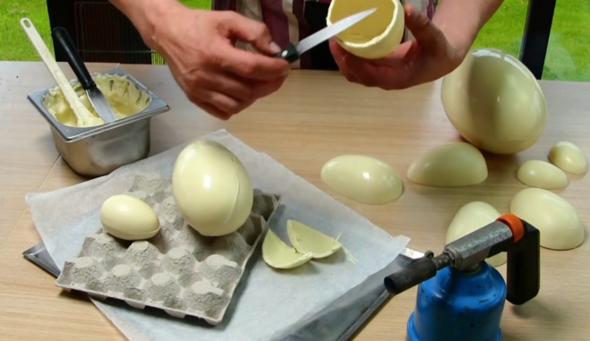 Bonjour, ici Sébastien, je suis avec Christophe. Donc aujourd'hui on va vous présenter la base pour faire ou réaliser un chien en chocolat blanc. La base sera avec de différentes coquilles d'œufs. Donc là vous voyez autour de vous le chocolat blanc et les différents moules à utiliser pour réaliser notre superbe chien en chocolat blanc.