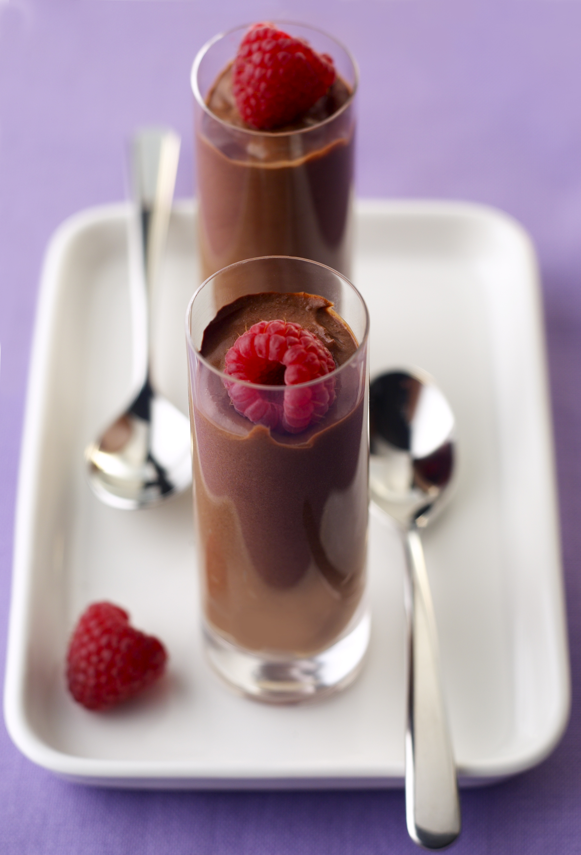 4. Placer 2 ou 3 framboises ou des poires en petits morceaux à la base de 6 petits verres à liqueur ou à vin. Déposer la mousse par dessus et mettre au frais pendant environ 30 minutes avant de servir.