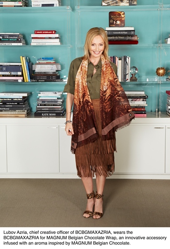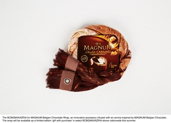 Disponible en cadeau pour achat dans une sélection de magasin de la marque en édition limitée le foulard BCBGMAXAZRIA pour MAGNUM est agréable à porter sur toutes les coutures. En effet, afin de faire ressentir « l’Effet Magnum », c’est-à-dire la même sensation de plaisir qu’en dégustant une glace Magnum, les deux marques ont décidé de pousser la mode au delà de ses limites pour un véritable festin sensoriel. Le design du foulard rappelle à la fois une glace Magnum au double caramel en train de fondre et la douceur du chocolat, avec des couleurs riches et une alliance de daim et de viscose pour un rendu soyeux. Mais le vrai plus de cet accessoire, c’est son odeur succulente : « l’arôme Effet Magnum » diffusé dans le foulard est un alliage subtil des ingrédients les plus exquis et délicieux du monde.