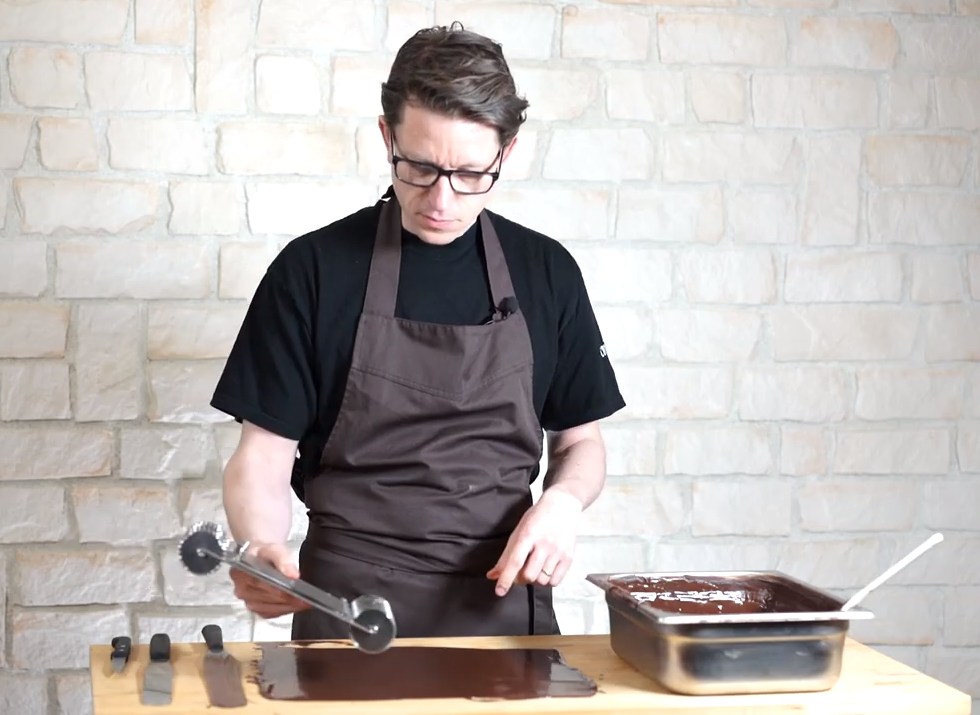 On peut commencer à effectuer le coulage du chocolat et bien l’étendre sur toute la feuille. Après il faut attendre que ça refroidisse de façon plus importante. On va ensuite passer avec les super ustensiles. Ils sont souvent utilisés afin d’avoir les tailles conformes et régulières. On pourra faire quoi que ce soit, des petits carrés. Si vous n’avez pas cet ustensile, il n’y a pas de souci. Vous n’avez qu’à prendre une règle ou prenez un couteau et en fonction… par exemple, il faut compter 1 cm voire 2 cm selon la taille et la dimension souhaité.