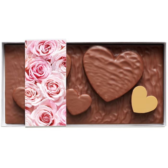 Pour Patrick Roger, la fête des Mères est une autre occasion de nous prouver son talent. Sans cesse en quête de perfection et d’innovation, il propose un joli cœur rouge cramois ! Ce cœur au chocolat noir 65 % pure origine Madagascar rempli d’amandes de Provence enrobées est paré d’un petit message d’amour manuscrit disait « Maman je t’aime ».