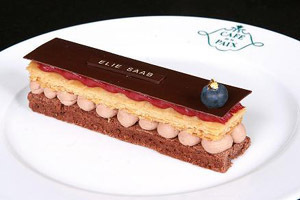 Féru d’architecture, Elie Saab a méthodiquement construit son Podium comme une superposition de cinq strates indépendantes - de haut en bas : plaquette de chocolat noir, crémeux de fruits rouges, feuilletage caramélisé, chantilly chocolat au lait et biscuit moelleux au chocolat - dont l’alliage inattendu créé une expérience gustative inédite.
