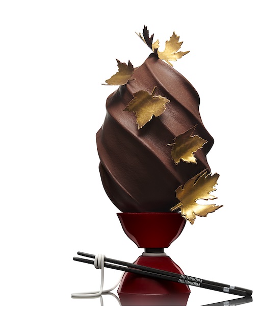 Le chef propose aussi un œuf de Pâques façonné pour l’établissement. Juché dans un diabolo qui vous fera retourner en enfance, un œuf tourbillonnant prend son envolée délicatement décoré de feuilles d’or, clin d’œil au fameux lustre de cristal du Peninsula. Rien n’est d’ailleurs laissé au hasard dans le design de ce dessert car les baguettes du diabolo sont une référence aux baguettes du restaurant gastronomique cantonais le LiLi.