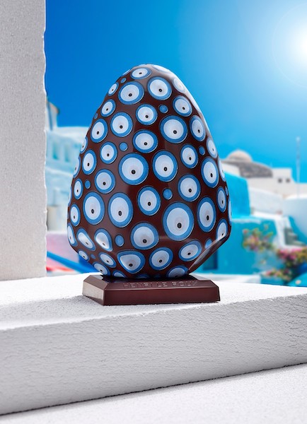 Sa robe de velours cacao est parsemée d’yeux bleus grecs, visant traditionnellement à éloigner le mauvais œil. En cacao de Madagascar, il se décline en chocolat noir, 70% de cacao et 45% de cacao. Une fois la tentation de le croquer apaisée, vous trouverez à l’intérieur une friture au chocolat noir et au lait. Habile clin d’œil à son coffret Méditerranée, le chef chocolatier Julien Gouzien signe un œuf de pâques renversant !