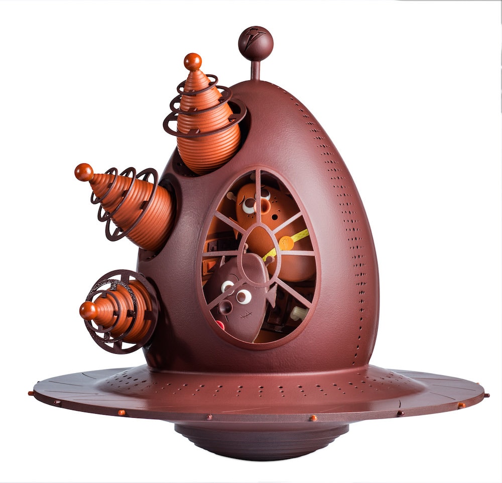 Un ovni unique réalisé en 10 exemplaires uniquement et entièrement fait main. Cette œuvre cacaotée nécessite pas moins d'une semaine de travail pour les équipes et 7 kg de chocolat. Cet œuf est réalisé tel une poupée russe.