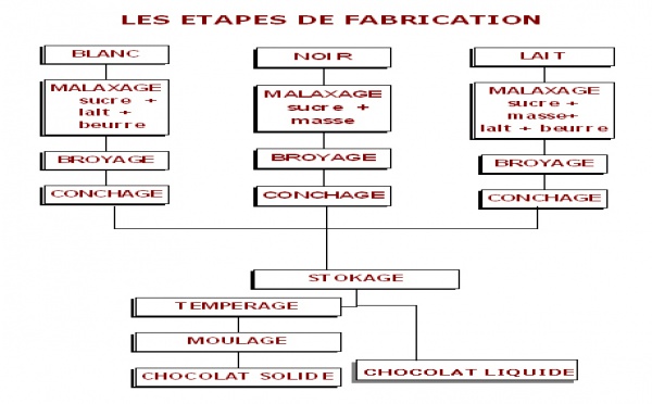 Le chocolat est un mélange de masse de cacao, de sucre, de beurre de cacao et éventuellement de lait. Le pourcentage de chaque élément dépend de la variété et du type de chocolat à obtenir. LE MALAXAGE La masse de cacao est mélangée aux autres matières premières (sucre et éventuellement produits laitiers) dans un pétrin muni...