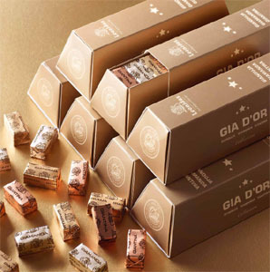 Chaque boîte cache des Gianduja, des Giantina et des Giamanda. L’or n’aura jamais été aussi savoureux. L’onctuosité