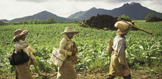 Femmes marchant dans un champ sur l'île Maurice le 9 février 2008