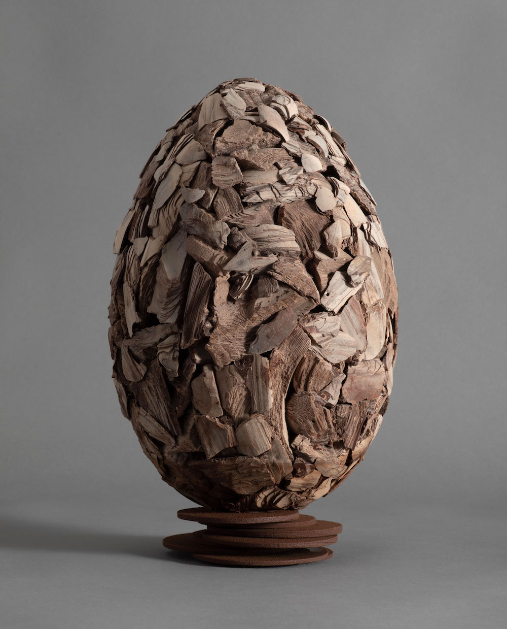 L’accumulation en couches de chocolat tempéré permet d’obtenir une « stratification », pour créer des éclats qui composent cet œuf. Fracturés, puis assemblés les uns aux autres, ces éclats de chocolat constituent une mosaïque, donnant le galbe de l’œuf traditionnel de Pâques, symbole de la renaissance et du renouveau.