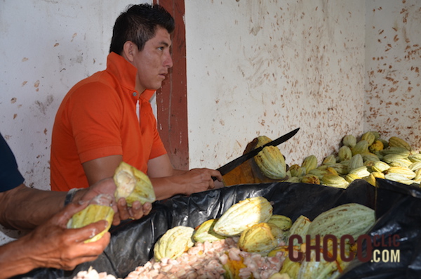 On procède : avec un couteau dans le sens de la longueur ou perpendiculairement au grand axe en frappant les cabosses sur une pierre ou une bille en bois. On extrait ensuite les fèves et on les sépare du placenta avec 2 doigts.