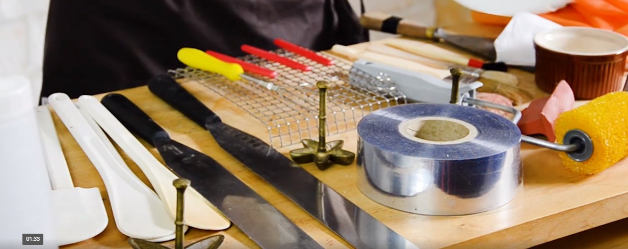 Nous avons ici un rouleau, si vous voulez faire de la décoration ou des fonds. C'est un rouleau peinture comme avec un petit peu une forme de nid d'abeilles qui vous permet d'avoir une texture vraiment différente, nous verrons cela aussi dans la formation. Et là nous avons un rhodoïd qui est un rouleau de film plastique spécial gâteau et avec cela vous pouvez réaliser vos rubans, des faux bois, etc. Donc nous verrons un peu plus de détails de tout cela dans la formation.