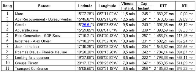 Du côté des protagonistes, Agir Recouvrement-Bureau Veritas qui s’était fait coiffer au poteau de la porte pour deux petites minutes par Aquarelle.com, a repris son poste de dauphin de l’imperturbable leader. Sur l’eau où beaucoup de choses, à ce niveau, se résument à des dosages de trajectoires, il occupe une position médiane entre Mare et Aquarelle.com et Geodis. Tous bénéficient d’un flux d’alizé établi plein est d’une quinzaine de nœuds. Des conditions stables qui permettent à Eole Generation-GDF SUEZ (Rogues-Delesne), 5è, et Initiatives-Alex Olivier (De Lamotte-Galfione), 6è, de recharger les batteries après un passage aux abords de Saint-Barth mouvementé. Et ceci est encore plus vrai pour Aloys Le Claquin et Ludovic Aglaor (Jack in The Box) qui ont fait une petite escale pour réparer un vérin de pilote hors service. Eprouvés par cet épisode, ils ont repris les chemins de la course et affichent un retard de 40 milles leur prédécesseur. Tout reste possible alors qu’en approche du golfe du Mexique, Eole promet de nouveau de déserter la place.[