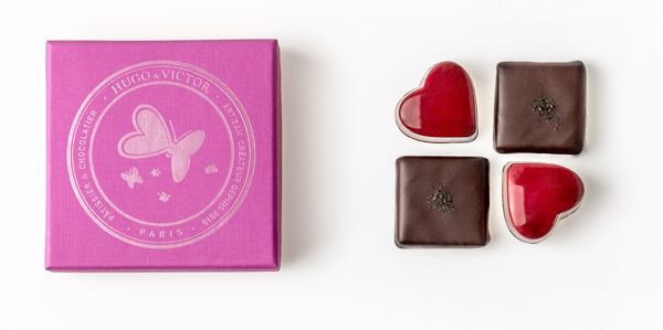 Pour la célébration de la Saint Valentin 2016, Hugues Pouget de la maison Hugo & Victor a choisi de la fêter avec un dessert papillon à partager à deux. Cette mousse de cranberry et ganache au thé vert jasmin se fondent harmonieusement à la pâte sablée croustillante. Ainsi le carnet d’écrivain devient carnet de poète et présente sous forme de papillons avec douze carrées. Cette création est donc un duo de cœurs et de carrés chocolat présenté comme un joyau.