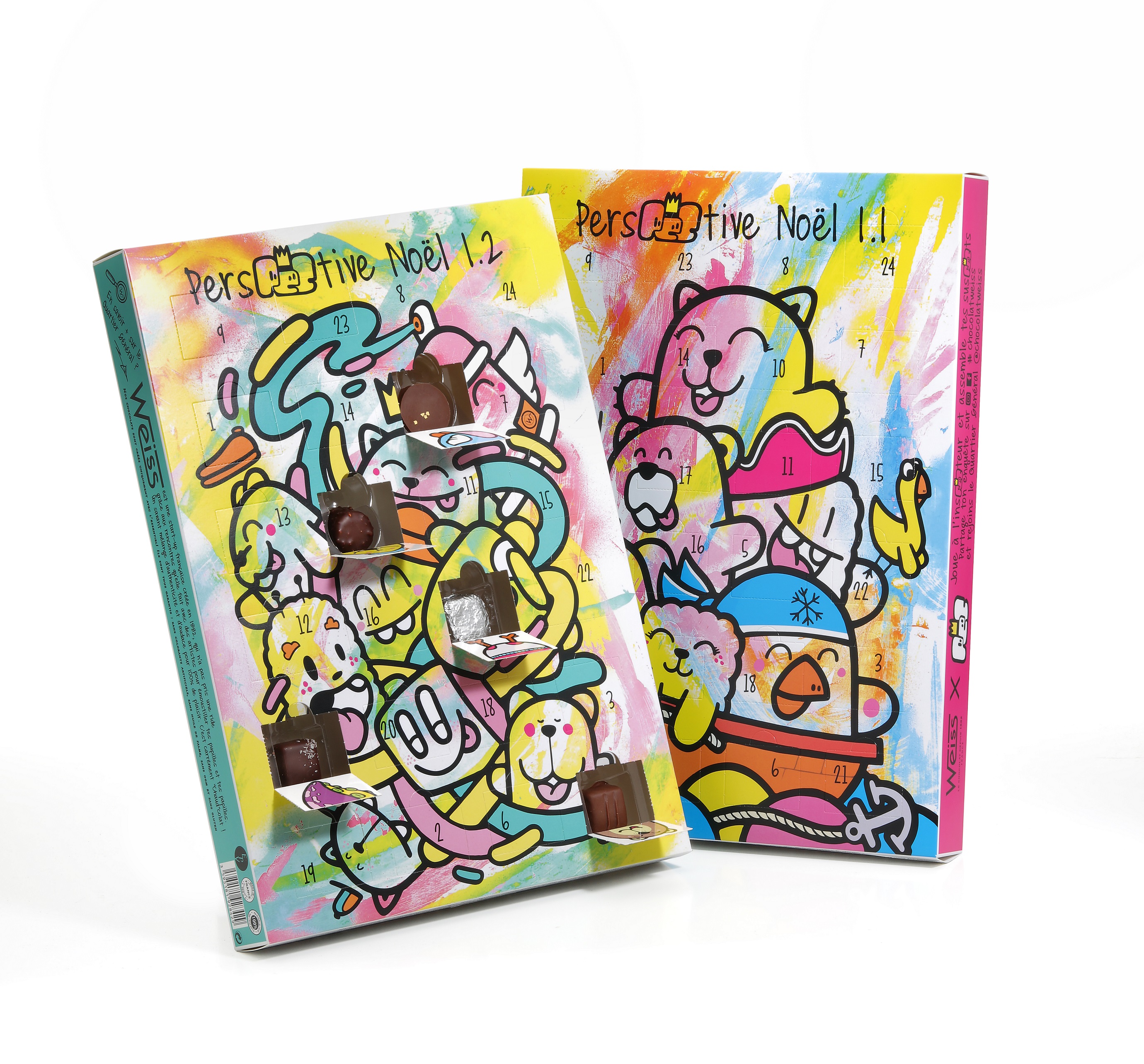 L’artiste lyonnais, PEC signe également une collection punchy, colorée et décalée. Il réinvente la gourmandise pour les amateurs de chocolat avec un calendrier de l’avent Perspective de Noël. Ce dernier est décliné en deux graphismes et un coffret Crock’ines. Quant aux cases, ils sont très faciles à ouvrir, laissant ainsi apparaître une gourmandise, un chocolat aussi beau que bon ! Ces créations ludiques et espiègles sont en édition limitée, à dénicher sans plus tarder, en boutique ou e-boutique.