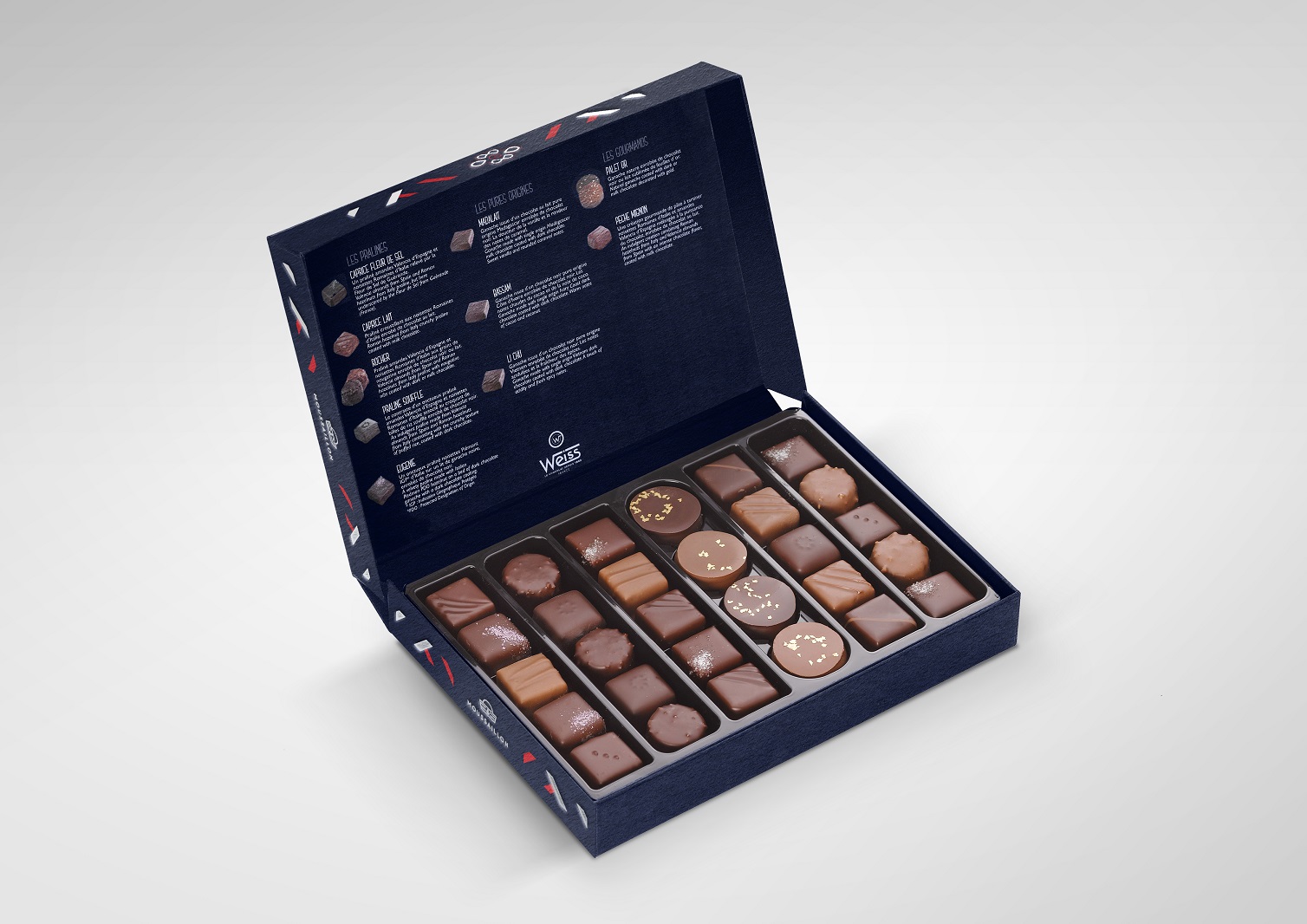 Reconnue pour son art de l’assemblage, la chocolaterie française Weiss compose de nouvelles harmonies et des chocolats uniques. Elle marie les crus de cacao et les ingrédients nobles. Cette signature gustative au savoir-faire artisanal est sublimée par des coffrets raffinés aux créations audacieuses et un brin décalé !