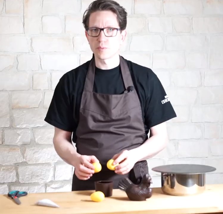 Nous allons ajouter un petit peu de chocolat et en mettre un petit peu au milieu, ce sont des choses qui ne se verra pas au niveau du décor. Ensuite, je pose ma poule pour voir quel effet cela peut donner, vraiment c'est cool. Donc là je vais fondre dessous pour que le collage se fasse beaucoup plus facilement, toujours en bougeant un petit peu, mais pas trop pour ne pas tout casser et je colle un peu plus avec mon cornet en dessous, nous n’avons pas besoin de bombes là tout est assez plat. Puis si vous souhaitez, vous pouvez rajouter d’autres œufs pour faire plus de décors, comme là j'en ai quelques-uns, on pourrait éventuellement en mettre un de plus pour faire un décor, vous pouvez également mettre des demi-œufs aussi. Nous allons pouvoir donc mettre peut-être un demi-œuf sur le côté ou un œuf entier ici par exemple donc là je colle ici, je regarde où cela peut coller entre les 2 œufs. Je vais y aller très délicatement et on peut faire la même chose ici. Toujours un petit peu vers le haut, nous allons redonner un peu de perspective, là on sent que cela va vraiment bien coller.