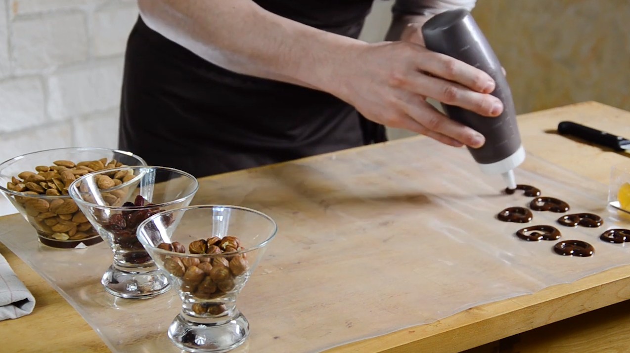 Dans cette vidéo, nous allons voir comment réaliser en fait des mendiants au chocolat. Moi, j’ai pris du chocolat noir, qui est à température de 32, 33°. J’ai pris pour faire les mendiants, des fruits confits, des noisettes, des cranberry et des amandes. Là, je les ai pris nature, mais vous pouvez bien sûr caraméliser les noisettes, les amandes, les faire torréfier, griller. Elles tiennent mieux et elles sont meilleures en goût. Ce sont des choses qu’on pourra voir pendant toute la formation.