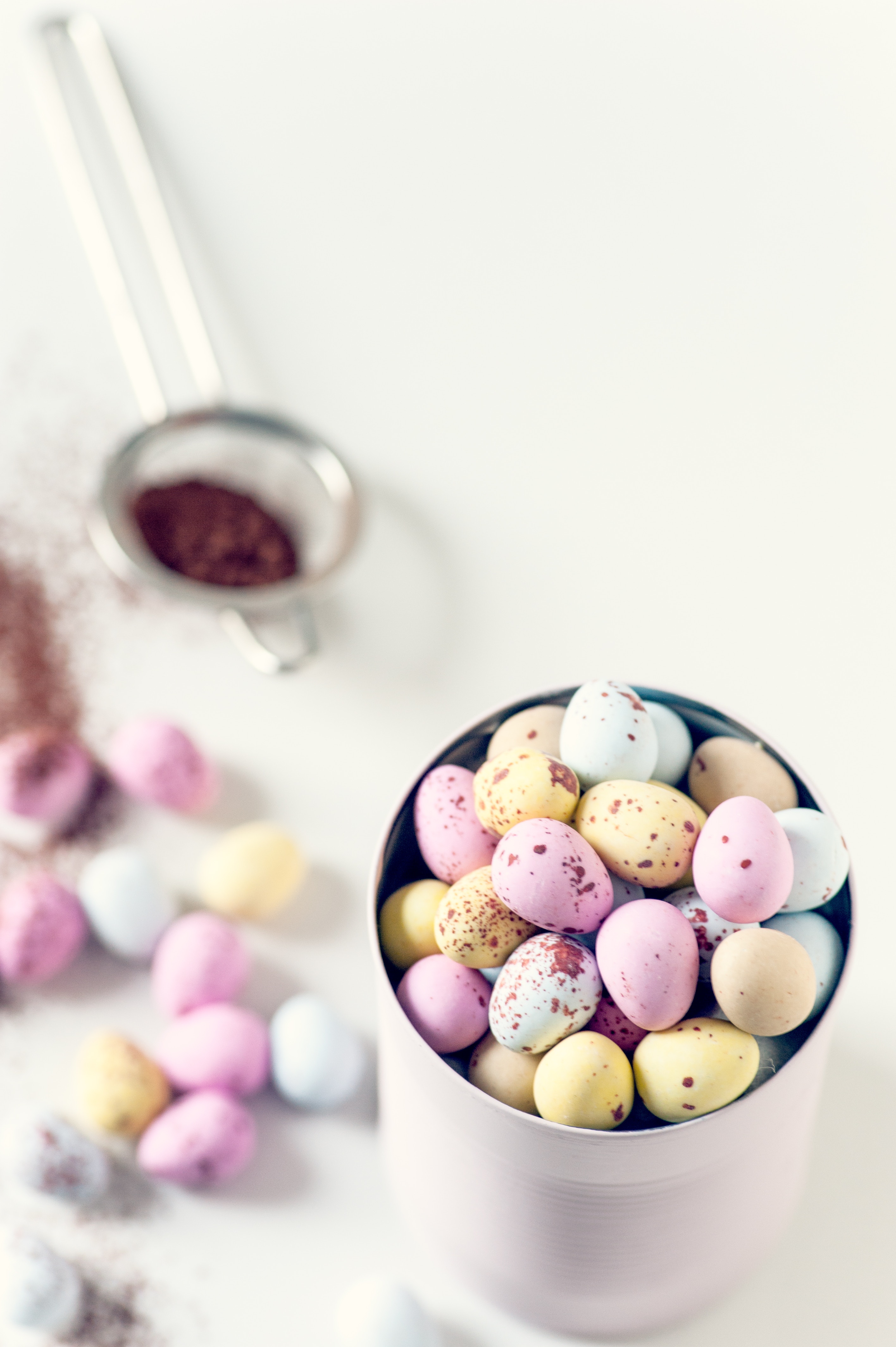 - Peu avant de servir, décorer le dessus du gâteau avec les éléments de son choix (œufs de pâques, feuilles en chocolat et sucre glace saupoudré au-dessus d’un pochoir.