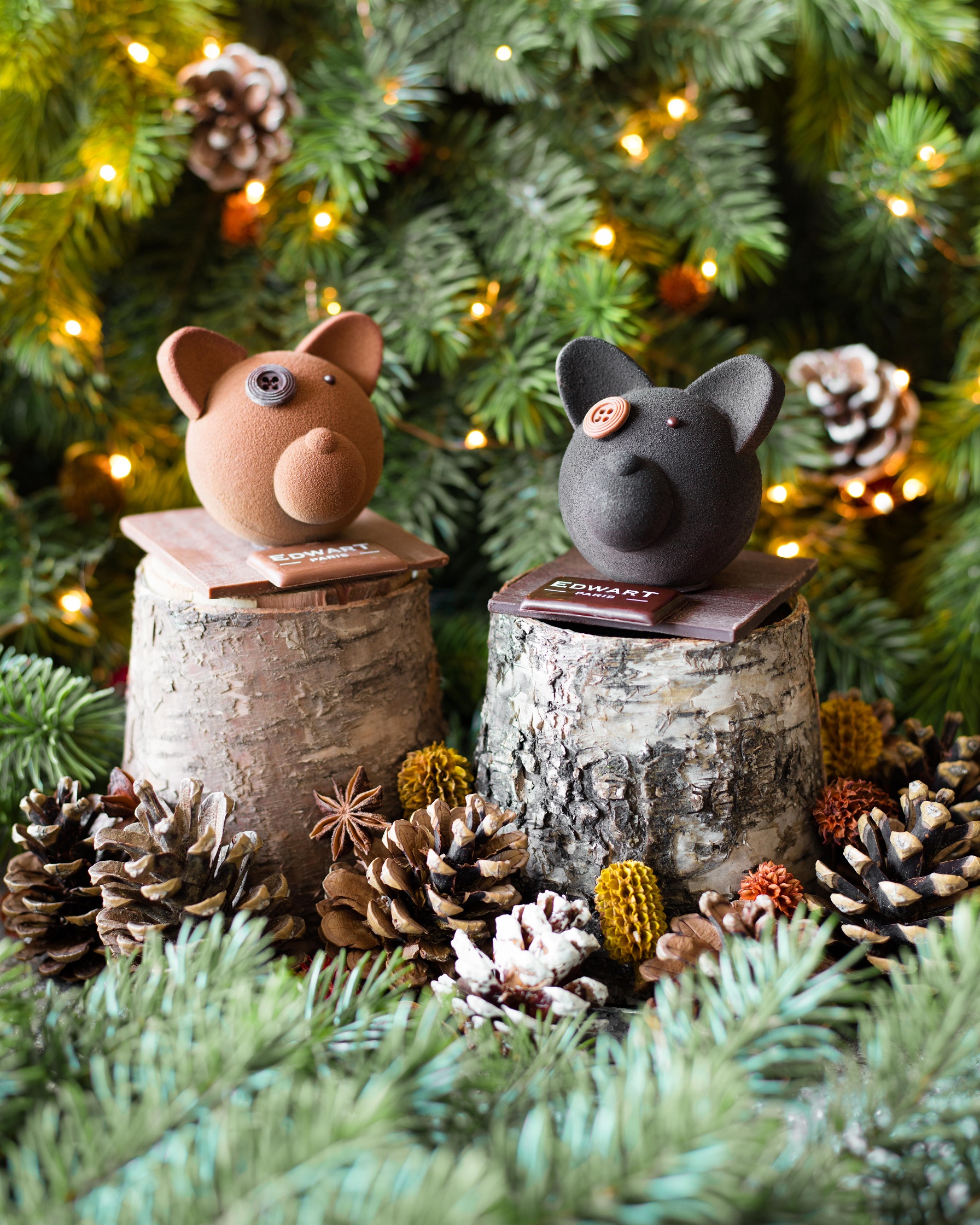 Avec les Petits Ours en chocolat, la chocolaterie nous reconnecte à notre âme d’enfant. Quant aux plus jeunes, ils vont avoir beaucoup de mal à résister. Inspiré du premier du tout premier cadeau de Noël d’Edwin Yansané, l’ours en peluche Zéphyr est disponible en version chocolat au lait et au chocolat noir Grand Cru de Tanzanie. La tête de cet ours chocolaté est garnie avec des amandes enrobées de chocolat noir et de poudre de cacao, quant à son corps, il est rembourré des noisettes enrobées de chocolat au lait et de praliné chaï pour ses pattes. Une véritable gourmandise à fondre de plaisir, les amateurs de chocolat risquent bien de ne faire qu’une bouchée de ces Petits Ours. Edwart Chocolatier propose également une version plus minimaliste de ses ours, avec Bobo, la petite tête d’ours. Disponible, là encore, en version chocolat au lait ou au chocolat noir, Bobo est intégralement garni de praliné noisette.
