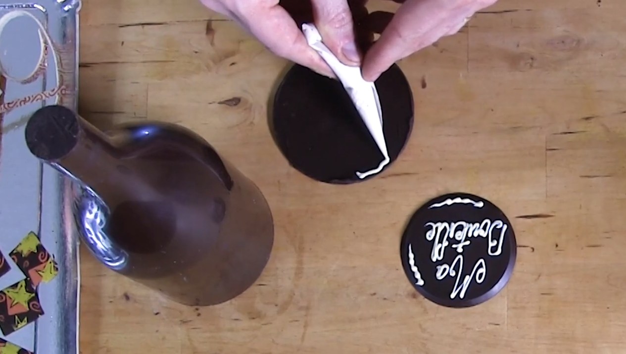 J’ai pris un petit disque pour écrire. Je vais écrire « ma bouteille ». Vous pouvez écrire « joyeux anniversaire ». Voilà ! Puis, je le collerai juste à la fin, à la dernière minute, vers la fin de la décoration. Là, on va coller la partie. Donc on va mettre du chocolat tout autour pour voir. En appuyant et en ébarbant, on a tout simplement… On va laisser refroidir le chocolat blanc.