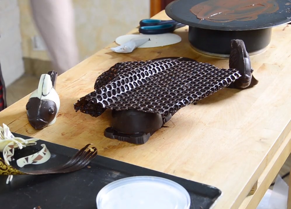 On va poser les deux poissons, vraiment sur les deux pièces, les deux supports. On peut les poser devant, mais c’est très risqué. Cela risquerait de se casser. Sur le flan, c’est dans le même esprit. Là, on va faire fondre celui-ci et qu’on prenne tout le chocolat et on va en rajouter. Ajoutez du chocolat, pour que cela puisse coller sans souci, pour qu’on ne se dise pas : « on a un souci, cela a du mal à coller », parce que là, on n’est pas sur deux faces planes pour que ce soit vraiment collé. On est sur vraiment des surfaces qui sont complètement différentes sur le bord.