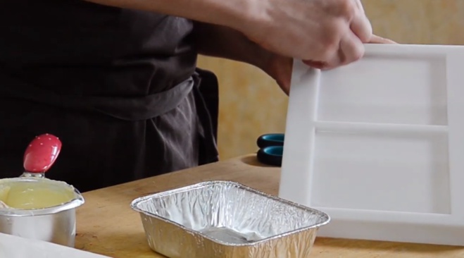 Voilà ! En général, une fois qu’on le fait, on le fait souvent à l’envers pour éviter de mettre de nouvelles poussières dessus. Je vous ai ajouté aussi un moule en aluminium, vous pouvez aussi utiliser cela pour votre tablette de chocolat, donc pareille, il faut toujours nettoyer avec un coton, pas obligatoirement, mais en tout cas, que ce soit bien propre, je vous ai laissé les cornets, donc-là je continue, bien évidemment. Hop ! Donc là il faut vraiment aller dans les coins, je ne vous cache pas que je l’ai fait tout à l’heure, cela permet de vraiment faire cela et on arrête pour éviter de continuer. Je préfère deux fois qu’une pour que tout soit propre, le moule en polycarbonate, bien faire partout et si vous voyez des traces et tout cela, n’hésitez pas ! Continuez jusqu’à ce que cela soit bien lisse et propre, voilà ! Tout simplement, hop, voilà. C’est prêt ! Ok super ! Donc là vous pouvez tourner cette partie-là aussi, comme cela ça évite de mettre des poussières supplémentaires.