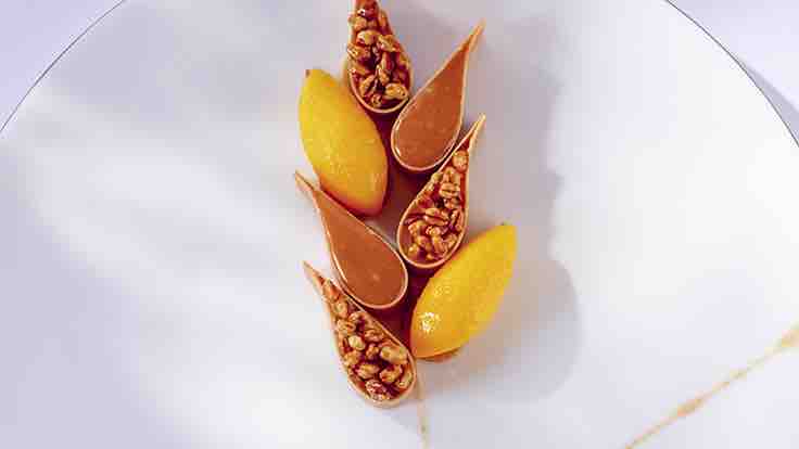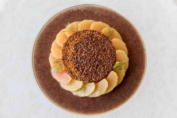 Jérémy Garnier, chef pâtissier du restaurant puise dans les trésors de sa région l’inspiration pour un dessert unique composé de sarrasin, d’algue, de citron et de caramel...