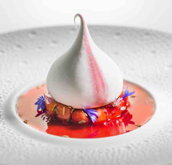 Le tout est saupoudré de graines de sarrasin soufflées et de poudre d’algue : une union inattendue et pourtant réussie qui s’achève sur les notes légères d’une meringue aérienne entourée de laitue de mer.