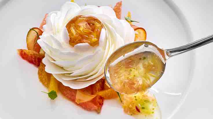Un visuel inspiré de la peinture impressionniste et de la splendeur naturelle des fleurs aux pétales de rose et à la meringue croustillante réveillée par un lit d’agrumes et un sorbet aux herbes.