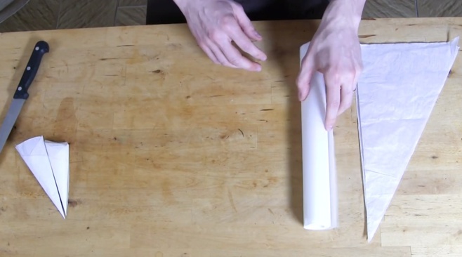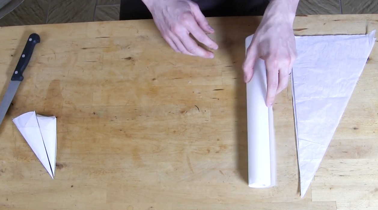 Dans cette vidéo nous allons voir comment réaliser un cornet en papier sulfurisé. Alors un papier sulfurisé c'est généralement du papier de cuisson que l'on utilise, vous la trouverez en magasin en rouleaux ou en grandes plaques chez les grossistes en pâtisserie, etc. Donc c'est du matériel qu'on peut facilement trouver ou par exemple lorsque vous avez acheté des pâtes feuilletées à cuire, ils mettent dessous un papier sulfurisé donc vous pouvez récupérer le papier comme j'en ai récupéré un là. Il est tout froissé donc là sachez que c’est beaucoup plus difficile à faire un cornet, mais je voulais juste vous montrer comment je les ai. Un cornet, au niveau du chocolat, de la pâtisserie, du décor est un outil indispensable au niveau de l'utilisation. Cela vous permet de finir les décors, de faire les collages, de faire vraiment une multitude de différents éléments qui permettent de mettre des fois la touche finale à vos décors.