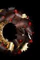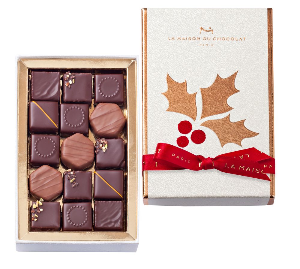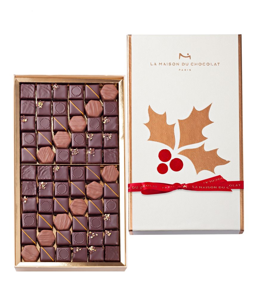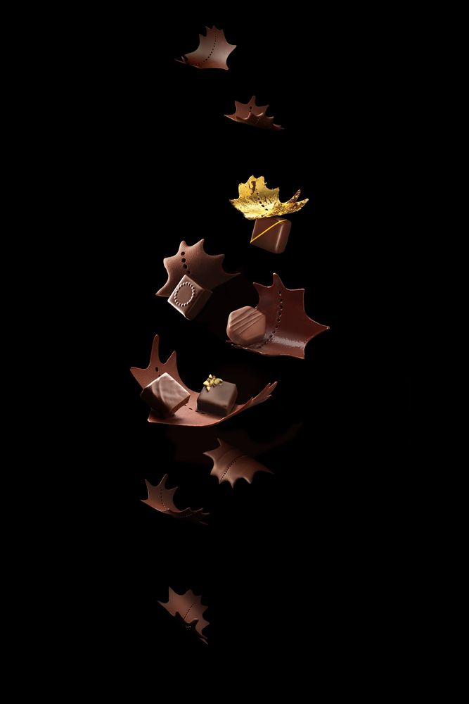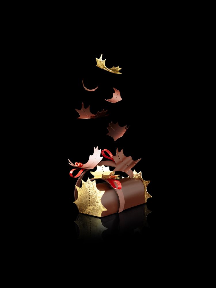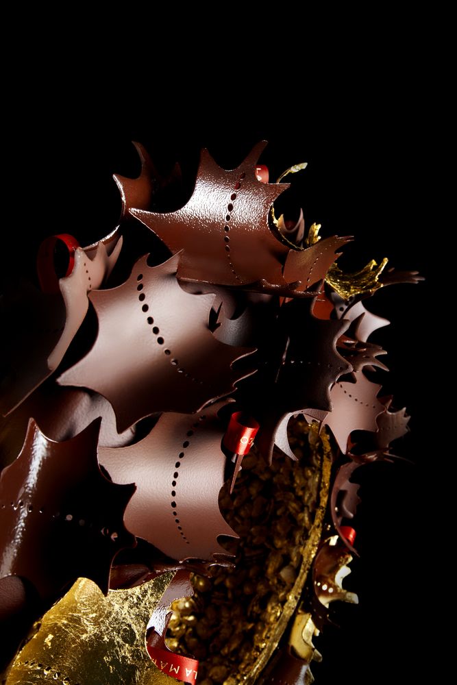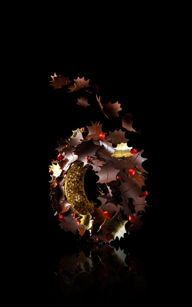 Les feuilles de houx s’envolent, se plient et tournoient sous le souffle d’une nuit... Paradoxe féerique conté par la Maison du Chocolat, unissant l’éphémère à l’immortalité dans une farandole aérienne qui entraine en son cœur la pistache de Sicile, la noisette de Piémont, la noix de cajou et l’amande de Valencia, toutes auréolées d’or. Sous les doigts d’orfèvre de Nicolas Cloiseau, le chocolat finement ajouré, tantôt glacé, velouté ou recouvert d’or fin, dessine un tourbillon d’émotions visuelles et gustatives dans un langage ciselé à l’extrême.