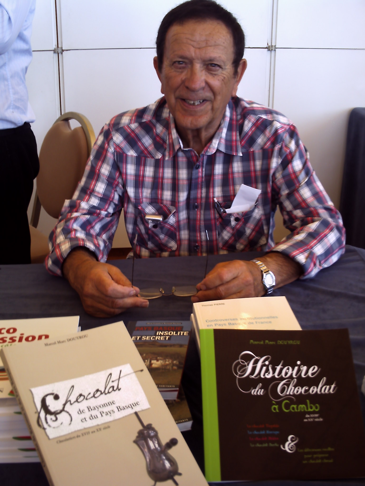 Marcel Marc Douyrou est un auteur de renom qui a vécu soixante-dix ans en Pays basque. Pour découvrir la culture du cacao et l’histoire du chocolat à Bayonne, il a collectionné depuis très longtemps les documents anciens qui ont trait au chocolat : papier appelé foulard, enveloppant les tablettes, étiquettes, affiches publicitaires, cartes postales, médailles, photos d’intérieurs d’ateliers de chocolateries… Tous ces documents, souvent rares, complétés par des recherches dans les minutes notariales, aux archives locales, nourrissent son dernier livre, “Chocolat de Bayonne et du Pays basque”.