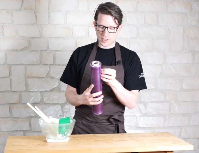 Une fois que votre chocolat est terminé, vous devez donc le ranger, vous avez terminé vos applications et tout, fabrication, je vous invite à ne pas le laisser dans le récipient sauf si vous allez en refaire le lendemain ou, etc., c’est de bien ébarber et enlever tout le chocolat sur toute la surface, pour que vous le mettiez en fait dans un film alimentaire. Pourquoi un film alimentaire ? Déjà d’une, cela ne prend pas de place. Vous allez voir pourquoi en fait. Quand c’est des petites quantités comme cela et que vous ne souhaitez pas garder ou en tout cas, utiliser, vous n’avez peut-être pas beaucoup de récipients, donc vous voulez utiliser juste ce qui a besoin, on va les mettre dans un film plastique pour plus facilement en fait les couper et les remettre quand on a vraiment besoin ou tout simplement dans une petite barquette en plastique très fine. Plus ce sera fin, et non pas un bloc de chocolat, plus vite la fonte se fera plus rapidement pour la prochaine utilisation. Donc, pensez à ma prochaine utilisation.